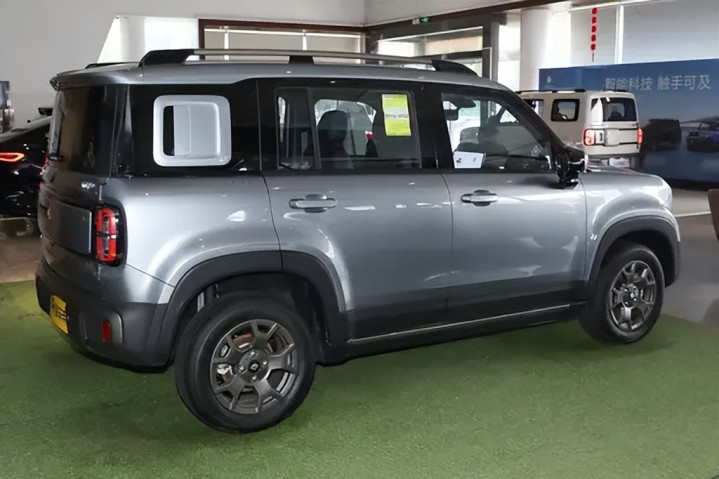 外观是消费者接触一辆车时最直观的印象,两款车在设计理念上的差异几乎是一眼就能分辨。宝骏悦也PLUS采用了近年来流行的“方盒子”风格,车身轮廓方正硬朗,给人以小号越野车的既视感。前脸设计采用了独特的四横四纵矩阵式灯组,点亮后辨识度极高,配合大面积的黑色包围与护板,使整车看起来更有力量感。保险杠的造型厚重,配合直立的车头线条,让悦也PLUS在城市道路中脱颖而出。侧面延续了方正设计,几乎呈现接近直角的车顶与腰线,提升了车内空间利用率,同时营造出一种“车小却不局促”的视觉观感。方形的轮拱搭配双色轮圈,进一步突出了硬派气质。车尾部分,方正的尾门设计和直立的尾灯组与车头呼应,侧开式尾门不仅增加了个性化元素,还在实用性上提供了便利,尤其是在狭窄空间中开启更显灵活。尾门的小储物格细节,也让整车更具生活化气息。